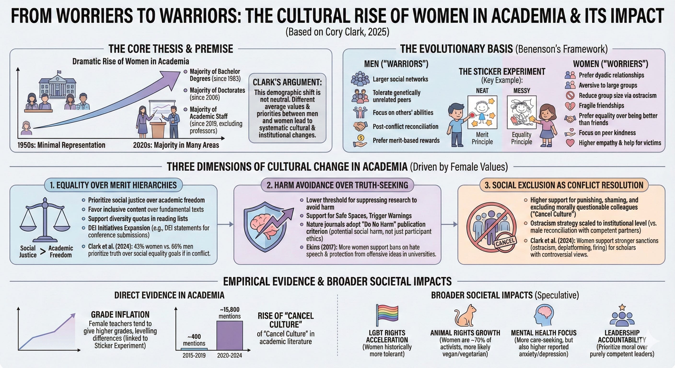 Clarks Artikel präsentiert eine provokante These: Der rapide Anstieg des Frauenanteils in akademischen Institutionen hat aufgrund durchschnittlicher psychologischer Geschlechtsunterschiede zu messbaren kulturellen Veränderungen geführt. Sie dokumentiert systematische Unterschiede in selbstberichteten akademischen Prioritäten zwischen Männern und Frauen und argumentiert, dass diese Unterschiede sich in institutionellen Veränderungen wie DEI-Initiativen, Noteninflation, Safe Spaces, Trigger-Warnungen und zunehmender “Cancel Culture” widerspiegeln.