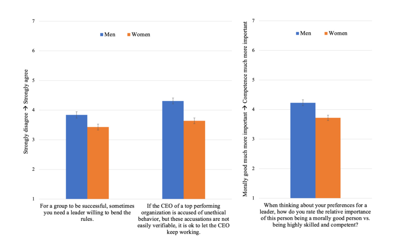 Rechenschaftspflicht kompetenter aber unethischer Führungskräfte: In einer eigenen kleinen Studie (n=500) fand Clark, dass Männer eher zustimmen, dass erfolgreiche Gruppen manchmal Führungskräfte brauchen, die bereit sind, Regeln zu beugen (d = 0,25), und dass es akzeptabel ist, einen CEO weiterarbeiten zu lassen, wenn Vorwürfe unethischen Verhaltens nicht leicht verifizierbar sind (d = 0,44). Frauen priorisierten leicht moralisch gute Führungskräfte über kompetente, während Männer das Gegenteil zeigten (d = 0,34).